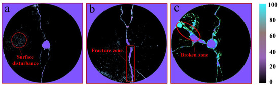 Figure 13 shows the damage characterization of the orifice surface of the HEEA-cracked concrete specimen. It can be seen that the main fracture zones of the three groups of specimens are all along the principal stress direction of the orifice. There are two main reasons for this phenomenon: one is that a large amount of heat and gas is accumulated near the orifice, resulting in thermal energy and stress mainly manifesting at the orifice position; the other is that during the initial drilling, disturbance damage is caused to the surrounding of the hole wall, and the high-heat and high-pressure gas preferentially spreads to the vulnerable area. Through comparative observation, it is found that the three types of HEEA caused different degrees of fracture to the specimen. Among them, part of the broken area appears on the upper left side of the specimen in Figure 13c, which is due to the high-temperature internal energy of HEEA-III. The stress of the specimen dropped sharply, and the disturbance to the specimen is more destructive, resulting in an obvious damage effect, indicating that the agent with high combustion heat and high combustion rate has a stronger rock-breaking ability. Combined with Figure 13a,b, the HEEA-I-damaged specimen has finer cracks, and the disturbance to the specimen is less destructive. The cracks of HEEA-II-damaged specimens are relatively regular and have good penetration. The results show that the high-temperature and high-pressure gas generated by the sample has an obvious damage effect, with the law that the rock fractured in the conditions of low heat and high gas specific volume has less disturbance and damage, and the rock fractured in the conditions of high heat and low gas specific volume has a large damage degree.