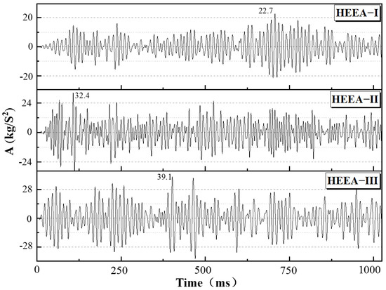 Figure 14 shows the acoustic emission signal curve of the concrete specimen during the damage process. During the process of the HEEA gas-induced specimen cracking, there are multiple oscillating signal peaks. This phenomenon can indicate that the process of HEEA cracking of the specimen is continuous, which is beneficial to the specimen being fully pre-cracked and damaged. In the early stage of deflagration, the HEEA with low calorific value and high gas specific volume is firstly subjected to small-scale pre-splitting of the rock. When the heat energy and gas are fully released, a relatively strong cracking process is carried out. Therefore, the maximum peak value of the oscillation signal of HEEA-I is significantly delayed, which has a positive effect on the further expansion and extension of the crack. In the initial stage of HEEA-II deflagration, several high peaks of oscillation occur, the amplitude intensity is up to 32.4 kg/s2, and the energy is continuously output with a high peak value of oscillation, which effectively ensures the stable expansion and development of cracks. The peak intensity of the maximum oscillating signal of HEEA-III is 39.1 kg/s2, but the continuity is not obvious. The above results further verify the damage characterization phenomenon of concrete specimens in Figure 10 and provide theoretical guidance for the flexible selection of HEEA engineering applications.