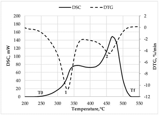 Non-isothermal TG/DTG/DSC analysis of non-treated and pre-treated at 275 °C biomass constituents of binary blends was performed separately in air and argon media (flow rate 50 cm3/min) in the temperature range of 25–650 °C and at a heating rate of 10 °C/min using Setaram Setline device. All binary blends were tested in air media at the same temperature regime. The sample weight in all experiments was 10 mg. Exemplified in non-treated softwood, DTG/DSC curves used for the analysis of biomass thermal degradation are presented in Figure 1. The peak values of thermal degradation of softwood at different degradation steps, including volatilization (1) and char thermal oxidation (2), were evaluated.