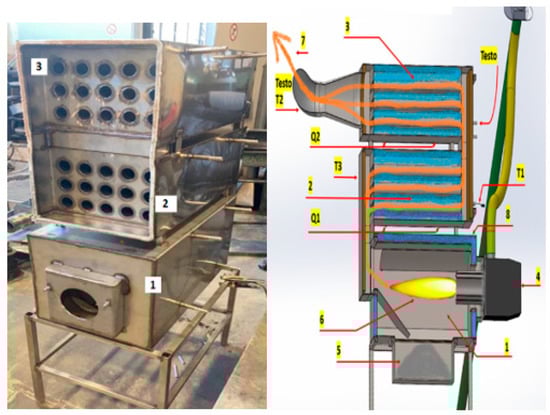 A digital image (left) and schematic sketch (right) of experimental device: a, b: 1—combustion chamber block (furnace), 2, 3—heat exchangers; 4.—burner, 5.—ash collector, 6.—flame, 7.—flue gases pathway, 8.—water supply to combustion chamber, T1, T2, T3—flue gas temperature measurements, Q1, Q2—calorimetric measurements of the cooling water flow.