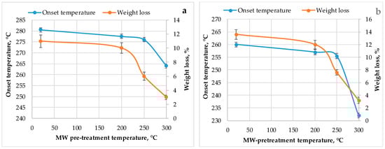 The effect of MW pre-treatment temperature on the weight loss and onset temperatures values at which exothermic effect occurred for pretreated and non-treated (20 °C) biomass according to DTA analysis: (a) softwood; (b) wheat straw [21].