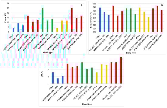 Tests of the influence of composition and temperature of MW pre-treated wheat straw and softwood binary blends with raw biomass pellets on the heat power of the device (a), temperature at the outlet of the furnace (b) and the volume fraction of CO2 in the products (c). Binary blends consisting of non-treated and pre-treated wheat straw, non-treated softwood and pre-treated wheat straw, non-treated peat and pre-treated wheat straw, non-treated wheat straw and pre-treated softwood, non-treated peat and pre-treated softwood are in blue, rich red, green, yellow, red-brown colors correspondingly.