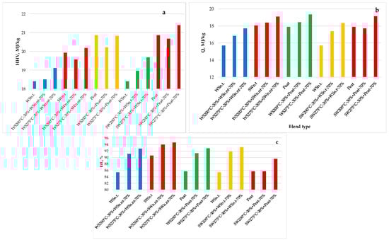 The results presented in Table 1 and in Figure 3 clearly indicate that both factors, increasing the calorific values of the formed volatiles and increasing the fixed carbon content, are responsible for higher heat output at combustion of MW pre-treated biomass. For softwood and wheat straw biomass MW pre-treated at 300 °C the heat released in the results of volatiles and char combustion during their thermal conversion exceeded that of non-treated biomass by 1.43–1.45 and 1.63–1.83 times correspondingly [21]. The results of the thermal analysis were confirmed by combustion experiments performed by the authors in a number of works [13,22,23]. It has been shown that MW pre-treatment of softwood and wheat straw pellets has a positive effect on the combustion process of pre-treated biomass creating the increased reactivity of pre-treated pellets, which causes faster and more complete combustion of volatiles. As a result, the CO content in products decreases as does the air excess, while combustion efficiency and the yield of heat obtained per unit weight of fuel increases in comparison with non-treated biomass pellets. This effect was explained by different factors: the thermal transformation of the chemical structure of the lignocellulose matrix due to the carbonization processes and the increasing porosity of pre-treated biomass. Based on the results presented above, in this work, the approach of co-combustion of MW pre-treated and non-treated biomass in the form of pellet blends was developed. The hypothesis proposed was as follows: the co-combustion of MW-pre-treated biomass with higher calorific values and non-treated biomass with comparatively low calorific values will result in more beneficial temperature conditions of thermal oxidation of raw biomass due to faster and higher heat output during the primary stage of thermochemical conversion of the blends and higher temperature in the combustion zone. Therefore, more complete combustion of non-treated biomass will be achieved in comparison with the process of non-treated biomass combustion. Correspondingly, the higher heat output in comparison with the results of additive principle-based calculations could be achieved. As was shown, the wheat straw and softwood biomass MW pre-treated at 275 °C has significantly higher calorific values vs. that of non-treated biomass including peat, suggesting a more significant synergistic effect in comparison to that of blends containing non-treated and 200 °C MW pre-treated biomass.