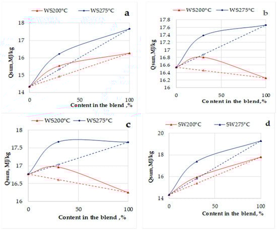 As follows from Figure 6a–d, the most pronounced synergistic interaction between MW pre-treated and raw pellets can be observed at pre-treatment temperature (T = 275 °C) of selectively pre-treated blends. For the blend of pre-treated wood with non-treated straw pellets (30%), the synergistic effect of produced heat energy reaches 9.8%, while for the blend of pre-treated and raw wheat straw pellets-5.8%.