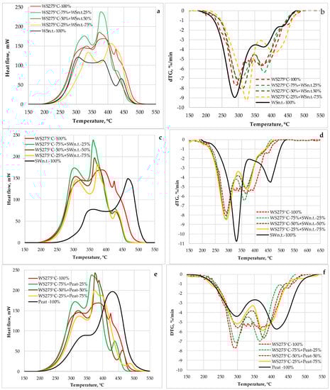 From the results of thermal analysis of selectively pre-treated biomass blends, it follows that in all cases the blends of MW pre-treated and non-treated biomass are characterized by combustion profiles DTG) and heat output profiles (DSC) (Figure 7 and Figure 8) with strong differences from those of separate constituents. Additives of pre-treated WS in the blends with non-treated biomass led to an increase in starting degradation temperature (Figure 7b) of blends in comparison with non-treated WS. Besides that, the peak area attributed to volatilization of biomass in the range of 200–350 °C is decreased increasing the portion of biomass degraded in the results of heterogenic char oxidation performed in the range of 350–550 °C. Additionally, the temperature at which the active heat output occurred was lower and the higher calorific values of volatiles were obtained at the initial degradation step of pre-treated biomass (Figure 7a). The strong decrease in both start degradation and onset temperatures promoting an increase in heat flow (heat output) decreases the total duration of thermal conversion of selectively pre-treated wheat straw blends in comparison with that of non-treated softwood biomass (Figure 7c,d). Moreover, the significantly lower temperature at which starts active heat release was observed for WS 275 °C-peat blends vs. non-treated peat (Figure 7e). The addition of pre-treated wheat straw strongly increases both volatile degradation and char oxidation rates decreasing the total time of thermal conversion of peat-containing blends (Figure 7f).