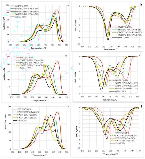 The blending of MW pre-treated softwood with that of non-treated leads to the insignificant shifting of starting degradation temperature of blends into the higher temperature zone vs. pure non-treated softwood (Figure 8b), which can be explained by the increase in activation energy of thermal degradation of MW pre-treated softwood biomass [21]. In contrast, the starting temperature of active heat release for blends is lower indicating the higher calorific values of volatiles formed from MW-activated biomass (Figure 8a). A more complicated effect of MW pre-treated softwood biomass on the thermal conversion of its blends with non-treated wheat straw and peat was observed. Again, additives of pre-treated softwood biomass significantly increase the temperature of starting the degradation of both biomass blends (Figure 8e,f). However, in this case, the temperature at which the active heat flow starts was higher for pre-treated biomass. This can be explained by the significantly lower activation energy of thermal conversion of both peat and wheat straw biomass in comparison with MW pre-treated softwood. According to [21], the activation energy of volatilization of wheat straw and peat consisted of 38 kJ/mol and 109 kJ/mol correspondingly in comparison with 168 kJ/mol and 208 kJ/mol for softwood MW pre-treated at 250 °C and 300 °C, respectively. As a result, the wheat straw and peat-derived volatiles with quite higher calorific values were obtained at comparatively low temperatures of thermal degradation. The results obtained substantially confirmed the results of real combustion tests including faster ignition and higher combustion rates of MW pre-treated biomass and their blends with raw biomass pellets vs. that of non-treated biomass [11,15,23]