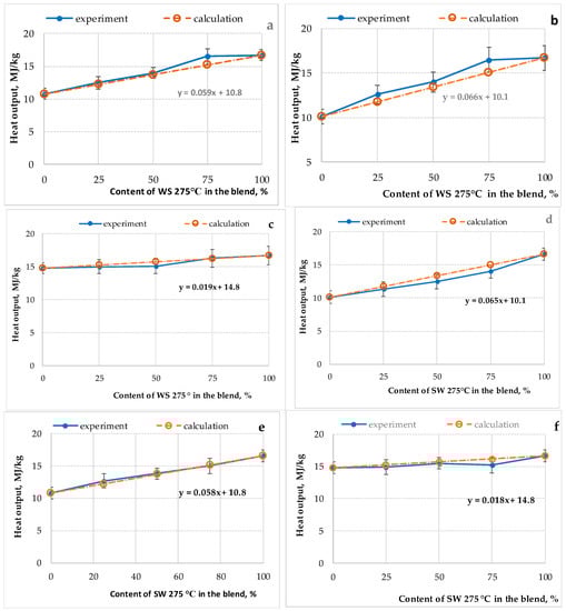 The experimental and calculated values of heat output of biomass blends of different origination and composition according to DSC tests: WS 275 °C-WS n.t. (a); WS 275 °C-SW n.t. (b); WS 275 °C-Peat (c); SW 275 °C-SW n.t. (d); SW 275 °C-WS n.t. (e); SW 275 °C-Peat (f).