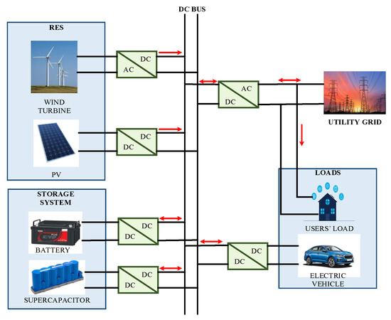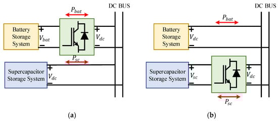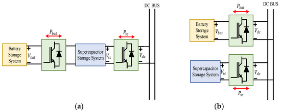 In the case of active interconnection topology, both battery and supercapacitor are connected to the DC bus through separate DC/DC bidirectional converters [30,35]. This connection provides maximum flexibility to the system and enhances its controllability. Hence, the system’s overall performance efficiency and life span are improved. Mainly cascaded and parallel active connections are two types of active topology.