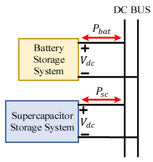 The simplest and cheapest connection of HESS with the MG is the passive type of connection [32,33]. A typical passive connection is shown in Figure 2. In this connection, the storage devices are directly connected to the DC bus without any power converters. So, for this type of connection, terminal voltage level matching of HESS with the DC bus or with the connected load should be the prime concern [36]. The system power requirement will be shared by the battery and supercapacitor according to their respective internal impedances [37]. For any sudden variation in the system, the momentary power is compensated by the supercapacitor due to its low internal impedance. However, the optimal utilization of HESS is not possible without controlled power converters. Again, the variation of the terminal voltage of the battery is very slow compared to the supercapacitor, hence it is very challenging to maintain the SOC of storage devices and the DC bus voltage [38]. This type of topology is not normally adopted in MG applications due to the following limitations.