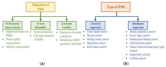 The integrated RESs, HESS, loads, and utility grids in a microgrid require a proper control scheme for the reliable operation of the system. For this, a proper power management system (PMS) is required, which ensures the power equilibrium in the microgrid. The power management technique is a two-level control structure. In the first level, it will maintain the DC bus voltage and current flow in the system. In the second level, the proper power allocation to the integrated devices, and SOC regulation of storage systems are mainly focused. The main objectives of the PMS are summarized in Figure 5a. The Coulombic and volumetric efficiencies of HESS should be maximized, while improving the power quality and stability of the system at the DC bus. Protection and lifespan extension of connected equipment. Nowadays, scheduling of loads is included in the PMS to avoid the peak hour rush and to reduce the operating cost.