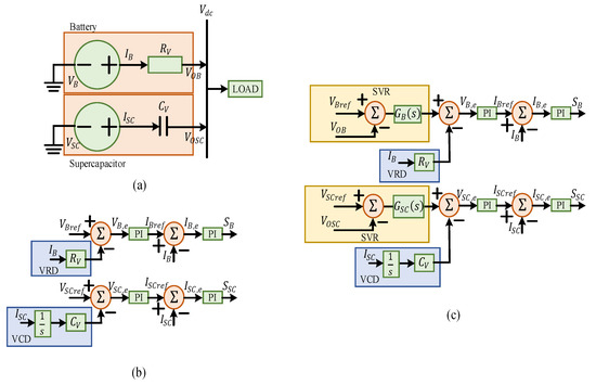 For optimal utilization of the HESS, a droop control technique is implemented in [44,45]. In this literature, a combination of virtual resistance droop (VRD) for battery and virtual capacitance droop (VCD) for supercapacitors was considered. The equivalent circuit diagram of HESS with droop control is shown in Figure 7a. The combination of VRD and VCD as shown in Figure 7b can be able to handle both high-frequency and low-frequency current allocation among supercapacitors and batteries. However, this control technique fails to manage the voltage deviation. Hence, a secondary voltage regulation (SVR) is introduced with droop control to control the bus voltage efficiently [46]. The SVR- based droop control for PMS is shown in Figure 7c. Along with bus voltage regulation, this method also recovers the SOCs of HESS irrespective of the leakage current. This SVR with droop control provides a stable dynamic system performance.