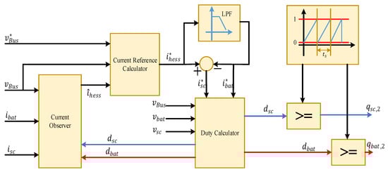 Because of the slow dynamics of the battery, the battery is not able to track the total reference current . For compensation of uncompensated battery current, a modified filter-based control technique was implemented in [10,30,43], as shown in Figure 6b. The uncompensated battery current is supplied by the supercapacitor units to improve the system’s dynamic performance. The filter-based control technique is very easy to implement, computationally efficient, and gives a faster dynamic response in the system.