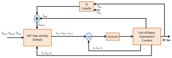 Model predictive control is an optimization-based technique that can predict the effect of future control decisions by considering the present system generation. Optimization of the present time frame is possible in MPC while maintaining the future time frame, i.e., it can predict the future in advance and accordingly take the corrective steps. In [50], a model predictive control scheme was implemented for power management in a fuel cell, SC, and a battery-integrated microgrid system. Here, MPC is used to produce the reference current for the power converters, and tracking of references is done by hysteresis control, as shown in Figure 10. Similarly, another efficient power management technique was proposed in [51] with less complicated control by using the MPC. Here, the MPC control helps to limit the current for both battery and supercapacitor and also allocates the high-frequency power requirements to the supercapacitor. This MPC can be implemented in a practical system if the control technique is discretized at a high sampling frequency.