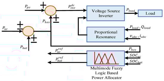 A combination of several IF and THEN rules creates the fuzzy logic control, which is basically based on the human experience and knowledge. For any complex system with a number of input variables, system variables, and disturbances, FLC is appropriate to control the system. A basic fuzzy logic-based power management scheme was proposed in [18] for a DC microgrid integrated with hybrid storage system. A FLC-based power management technique was proposed in [19], where varying bus frequency is used for controlling the microgrid system. Here, mainly FLC is employed to avoid overcharging and deep-discharging of the storage devices. Another FLC was proposed in [20] to allocate the reference power to the hybrid storage system. This proposed control technique is shown in Figure 11. Here, FLC will take the power difference between generation and demand, SOC of battery, and SOC of ultracapacitor as inputs, and finally, give the reference battery and ultracapacitor power as system output. This FLC-based technique gives a faster response and is insensitive to any parameter variations.