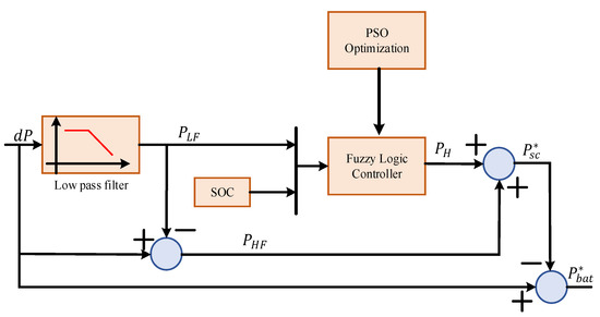 For effective framing of rules, some optimization techniques are implemented with previously discussed fuzzy logic control for effective management of microgrids. A bio-inspired algorithm has the capability to handle multi-objective functions and to give optimal solutions in various applications. A particle swarm optimization (PSO) technique was implemented in [52] to optimize the membership functions of FLC for the reduction of the battery peak current. This PSO-based power management structure is shown in Figure 12. The performance of this scheme effectively increases the lifespan of the battery by properly handling the dynamic stress and peak current in the system. In the proposed system, the utilization of supercapacitors has significantly increased compared to other conventional control methods.