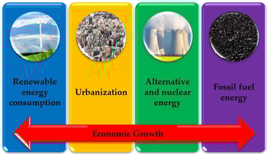 Several studies have been conducted to determine the influence of energy use on economic development. Tang et al. (2016) [] examined energy consumption, FDI, capital stock, and economic growth in Vietnam and found that energy consumption, foreign investment, and capital stock all had a favorable influence on economic development. Using a fixed-effect model and a nonlinear threshold model, Wang and Wang’s (2020) [] study on renewable energy consumption and economic development demonstrated that renewable energy had a threshold influence on economic growth in OECD economies. Furthermore, Khan et al. (2019) [] investigated the effects of coal consumption, oil consumption, natural gas consumption, and economic growth on environmental degradation in Pakistan, and the findings showed that economic growth, coal consumption, oil consumption, and natural gas consumption all had a positive impact on environmental degradation. Similarly, in a study on foreign direct investment, economic development, and renewable energy, Wei et al. (2022) [] discovered that renewable energy was substantial and negative in terms of greenhouse gas emissions, but foreign direct investment was significant and beneficial. The primary goal of this study was to analyze the influence of renewable energy consumption, alternative and nuclear energy, urbanization, energy usage, and fossil fuel energy consumption on Romanian economic growth. In order to discover the relationship between variables, we developed the following model: