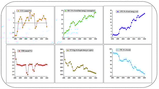 Furthermore, in the econometric analysis, we first employed the basic statistical tests including descriptive analysis and correlation among the variables, and then stationarity was tested by using the ADF and P–P unit root testing. After this, the study utilized the bounds tests for the approval of cointegration with the J-Cointegration test for further robustness. At the end, shot-run and long-run estimations were carried out via the ARDL technique with the conjunction of FMOLS and CCR techniques. Figure 1 illustrates the map of the study variables to the economic development, while Figure 2 shows the variables trend based on annual data ranges from 1990 to 2020.