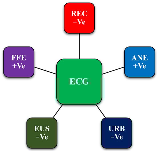 where ECG represents economic growth, REC represents renewable energy consumption, ANE represents alternative and nuclear energy, URB indicates urbanization, EUS represents energy use, and FFE represents fossil fuel consumption. In addition, indicates the error term and time is measured through t. The coefficients of the model are uncovered through –. Additionally, an ARDL technique was utilized in this investigation, which was first established by the famous economist Pesaran et al. (2001) [], in the directive to demonstrate the linkages among the various variables. The ARDL technique is used when there is a long-term association among the variables. In consequence, when the variable is considered stationary at [I(0) and I(1)], the constraint is no longer relevant, because it no longer happens. In a manner comparable to this, it has been found that the technique of ARDL offers an efficient explanation to the problem of incorrect regressions brought on by variables that have been omitted or left out. The main motive of this investigation was to examine both the long-term and short-term connection that exists between economic growth and the other variables under analysis. If we want to find cointegration in a model, we may use an ARDL model with an error correction term. The ARDL model is specified in the following way: