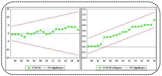 If the time series variable has a unit root, the unit root test will reveal whether the series is stationary or not. The null hypothesis is often defined by the existence of a unit root. The alternative hypothesis, on the other hand, might be stationarity, trend stationarity, or explosive root, depending on the particular test that is being used. Furthermore, ADF and P–P unit root tests are utilized in this analysis [,]. ADF and Phillips–Perron unit root tests are used to assess whether any of the analyzed variables has an order I(2). The stationarity of variables in ARDL models is not checked in advance using unit root tests. In the I(2) for example, the ARDL bounds test function fails with a null outcome. The consequences of the ADF and the Phillips–Perron unit root test demonstrate that none of the variables have integrals in the order of I(2), as shown in Table 5. Because of this, the ARDL bounds test model is chosen for use.