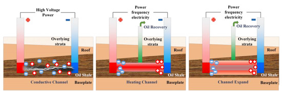 High-voltage power frequency electric heating in-situ pyrolyzing (HVF) technology is a novel oil shale underground in-situ exploitation method. In general, HVF processing can be divided into three processes [11]: (1) breaking down oil shale with high-voltage power to form a conductive channel which converts oil shale from an insulator to a conductor; (2) heating oil shale with frequency power through the Joule heating effect of the conductive channel so that kerogen in oil shale is pyrolyzed and converted into oil and gas; (3) the heating and pyrolyzing area expands to the periphery, resulting in a large volume of pyrolysis. This process is shown in Figure 1.