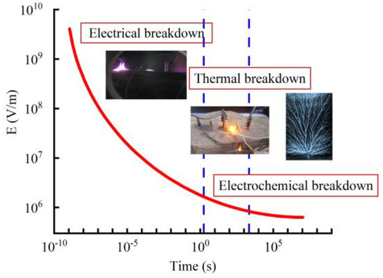 A breakdown determines the implementability and efficiency of HVF, which represents an essential process requiring further investigation. HVF technology is derived from the mechanism of a solid dielectric breakdown, which can be classified into three types—electrical, thermal, and electrochemical breakdown [12,13,14,15]—according to the relationship between the electric field intensity and the electric field action time, as shown in Figure 2. (1) An electrical breakdown is a phenomenon where the dielectric is directly damaged and loses its insulation property due to the action of the electric field because the charged particles in the medium connect instantaneously after the energy accumulation [16,17]. The electric field intensity of the electrical breakdown is generally high, about 106–107 V/cm, for a very short time, generally 10−8 s [15]. There are many theories about electrical breakdowns, including the avalanche breakdown theory [18,19,20,21], the charge trap theory, the collision ionization breakdown theory, etc. [19]. (2) A thermal breakdown occurs at a relatively lower electric field intensity, which is insufficient to induce an electrical breakdown. When the heat generation caused by the dielectric loss is greater than the heat dissipation, the temperature of the dielectric will continuously rise, causing decomposition and carbonization of the dielectric and resulting in insulation failure [17,22,23,24]. Temperature is an important factor affecting a thermal breakdown, and increasing the temperature of the dielectric would reduce the breakdown field intensity, according to Wagner’s theory, which is a classical theory of thermal breakdown [25,26]. (3) An electrochemical breakdown refers to the irreversible deterioration of the dielectric chemical properties due to a partial discharge in the dielectric under the long-term action of a low electric field intensity, which gradually reduces the insulation performance and causes a breakdown [27,28,29].
