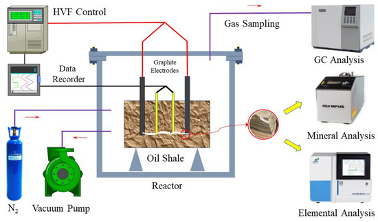 The samples were preheated to the specified initial temperatures by the reactor within a nitrogen environment, following the subsequent steps: the reactor was pumped to vacuum conditions, and nitrogen was injected into the reactor until it reached a normal pressure; the nitrogen was heated in the reactor with the electric heaters to heat the oil shale; then, the oil shale was heated to the required initial temperature at a heating rate of 50 °C/h for 6 h. The purpose of pre-heating was to verify whether the thermal breakdown of the oil shale conforms to Wagner’s theory, which states that increasing the initial temperature will reduce the electric field intensity of a thermal breakdown.