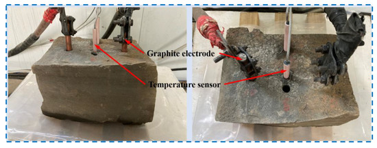 The electrodes were arranged perpendicular to the direction of the oil shale bedding, and the distance between the electrodes and the edge of the oil shale was no less than 5 cm, with the electrode arrangement at a depth of 7 cm. The depth of 7 cm has several purposes: (i) to ensure a good contact between the graphite electrode and the oil shale; (ii) to make the breakdown occur inside the oil shale as much as possible, not at the edge, so that its temperature change is less affected by the external ambient temperature. One temperature sensor was arranged at the electrodes’ midpoint, and another, on the mid-perpendicular point of the two electrodes’ connection 5 cm away from the midpoint, as shown in Figure 4.