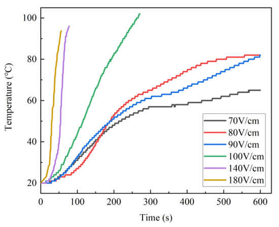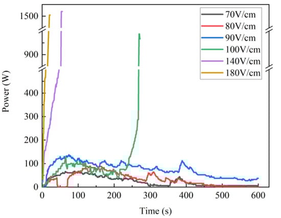 In the experiments with the electric field intensities of 70, 80, and 90 V/cm, no breakdown occurred, while the temperature showed a slow rise and then tended to be stable; the stable temperatures gradually increased with the increase in the electric field intensity and were 65, 81, and 82 °C, respectively, as shown in Figure 5. The heat generation power exhibited a rapid increase at first and then a slow decline; with the increase in electric field intensity, heat generation power gradually increased to 67, 89, and 138 W, respectively, as shown in Figure 6.