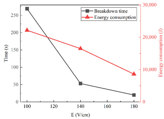Changes in the breakdown time and energy consumption with different electric field intensities.