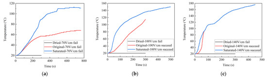 Oil shale temperature changes with time in the different moisture content experiments. (a) Electric field intensity of 70 V/cm; (b) electric field intensity of 100 V/cm; (c) electric field intensity of 140 V/cm.