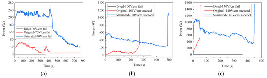 Prior to the breakdown, the heat generation power of the saturated sample was consistently greater than that of the original sample, as shown in Figure 10b,c. The breakdown time is longer for the saturated sample than for the original sample because the heat loss is much larger than the original sample due to more water evaporation.