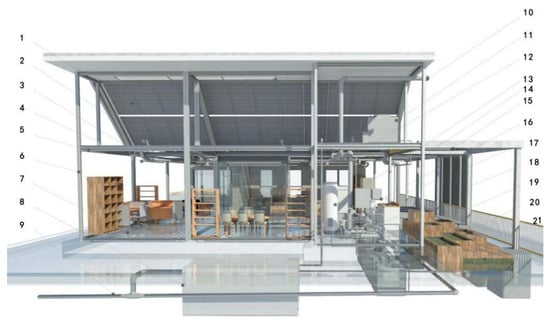 | Structure | Modular framework system | 5 | 100 mm × 100 mm H beam | Setting on the strip foundation used for transferring roof load |