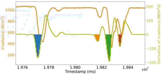 Figure 1 shows some of the clouds detected with the algorithm, being represented the irradiance and its derivative. Clouds detected are marked in colours automatically. Colours are random and only serve to differentiate between clouds.
