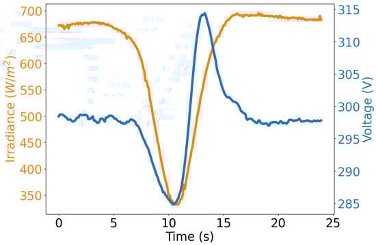 Figure 2 and Figure 3 show the irradiance and voltage signal when two different cloud passages occur.