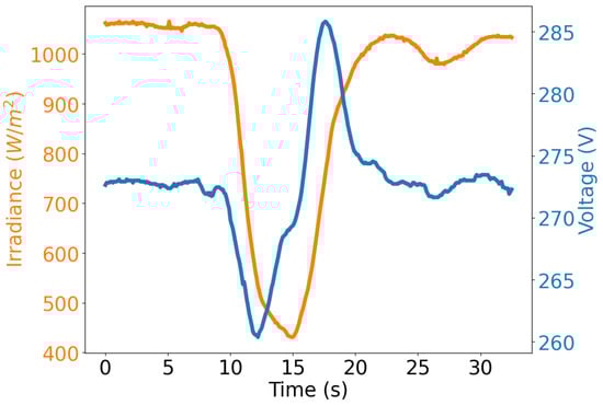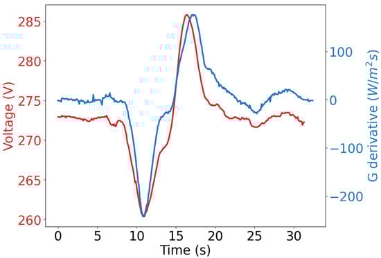 In all recorded clouds it has been observed that there is a direct relationship between the irradiance derivative and the system voltage. An example is shown in Figure 8.