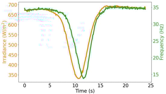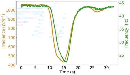In order to simulate a change in irradiance and its corresponding voltage drop through a frequency input, it is necessary to analyse how the frequency of the system behaves when the cloud passes over the PV generator.