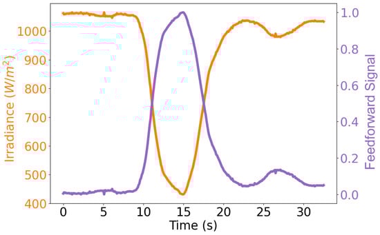 The shape of the curve obtained is the same that the inverted irradiance because it has to be added through the feedforward input as a positive signal. The minimum point in the irradiance is now a maximum in the feedforward signal with an amplitude of 1. This means that we get a signal that has the same waveform as the original, but the level of disturbance it produces will depend, as we will see later, on the total amplitude of the signal.