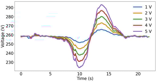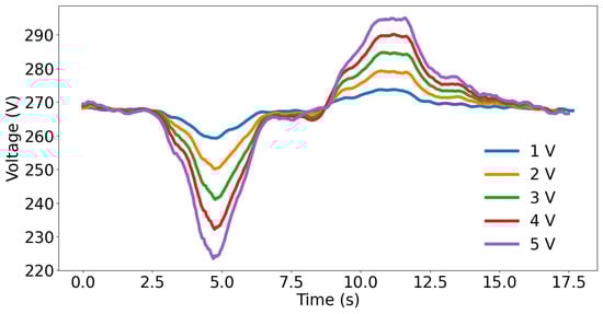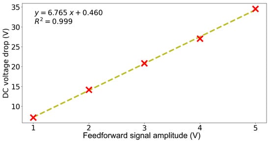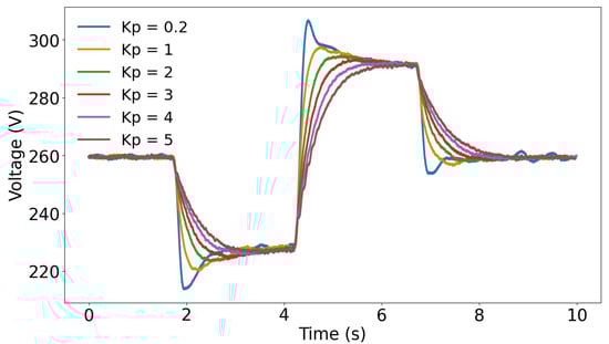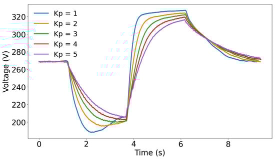 As said before, a good value of is one that makes the voltage signal as close to a square signal as possible (derivative of the triangular feedforward signal). As can be seen in Figure 15, this value is between 2 and 3. For smaller values, an overshoot in the system voltage signal is observed, while for larger values, the response slope is smoother.