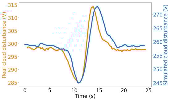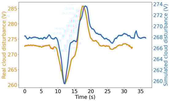 Figure 13 and Figure 14 show the system voltage response for clouds 1 and 2, with real and simulated clouds, to compare their shapes. It can be seen that the shapes of both curves are similar. The voltage scale is not the same because the samples of real and simulated clouds have been collected at different maximum power point voltages. This is because the real cloud sample was taken in winter, when the working voltage is higher due to lower temperatures. The simulation was performed in months where the temperature was higher, so the maximum power point voltage was smaller.