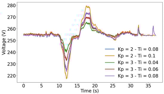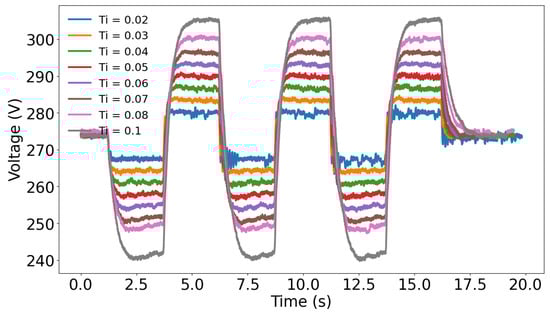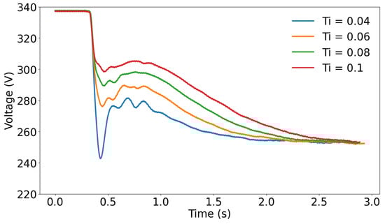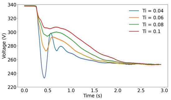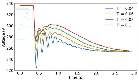 Once a suitable value of is obtained, different values of are tried. This can be seen in Figure 17, where the signal keeps the same shape, but the amplitude changes. Extreme values would not be good because the system would not be robust. In the other hand, with values very close to 0, small oscillations start to occur, which would increase the risk of instabilities. However, lower values reduce the system voltage drop, so a correct value would be around Ti = 0.03.
