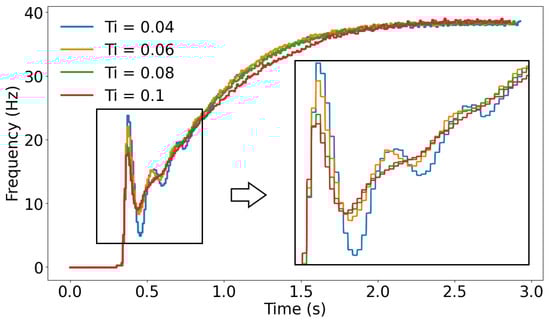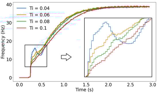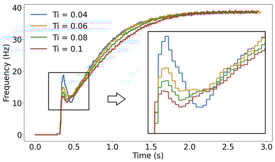 The ideal start-up will be one in which the frequency describes a fast (about 2 s) and monotonically increasing rising curve. However, it is not possible to obtain good start-up and normal operating values at the same time. The solution, as already mentioned, is to find a compromise between the ideal parameters for start-up and normal operation. A good value, used only for start-up, would be and , as shown in Figure 21. However, as seen in Figure 17, an optimal value for normal operation and to support the cloud pass would be and .