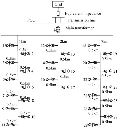 A detailed WF consisting of 28 × 1.5 MW DFIGs (DFIG_1—DFIG_28) was set up in the MATLAB/Simulink platform, as shown in Figure 3. The model parameters are given in Table A1.