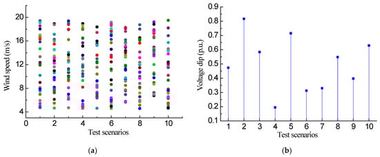 To verify the adaptability of the proposed model (PM), ten groups of input wind speed and fault voltage dip were randomly generated, which are shown in Figure 4. In each scenario, the wind speeds were assigned to the WTs in WF, and the voltage dip was realized by setting a three-phase symmetrical short-circuit fault at the midpoint of one transmission line.