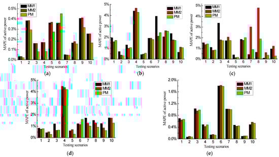 Under the operation conditions of Figure 4, the dynamic responses at the POC of the DM, MM1, MM2 and PM were sampled. The active and reactive power errors of different equivalent WF models were calculated according to Equations (4) and (5), respectively, as presented in Table 2 and Table 3. According to the values given in Table 2 and Table 3, the differences in accuracy of the three equivalent models are illustrated in Figure 5 and Figure 6, respectively.