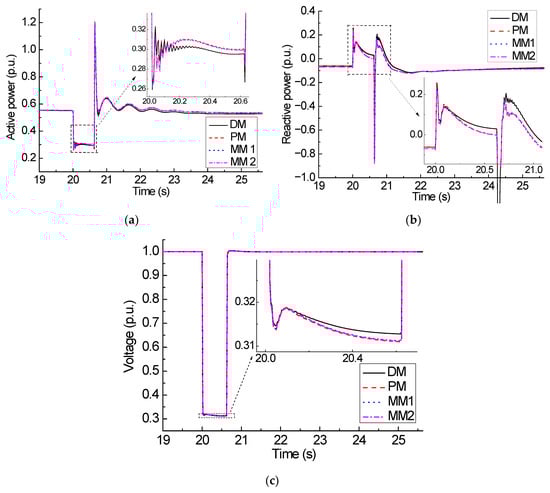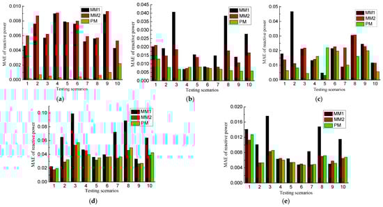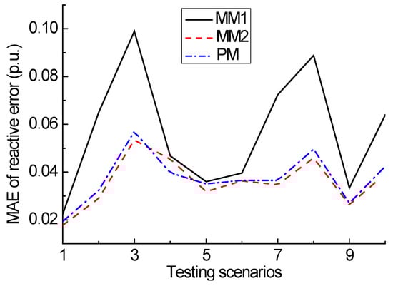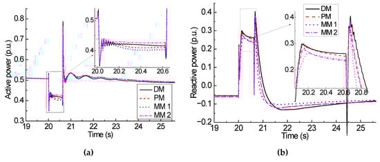 As shown in Table 3 and Figure 6, for the pre-fault phase (), the PM established in this paper also shows higher reactive power simulation accuracy. For the other four phases, the reactive power performance of the PM is between MM1 and MM2 in some scenarios. However, taking the early fault recovery phase into account, where the above phenomenon appears more often, the reactive power errors of each model are illustrated in Figure 8. It can be seen that the reactive power performance of the PM is also more stable.
