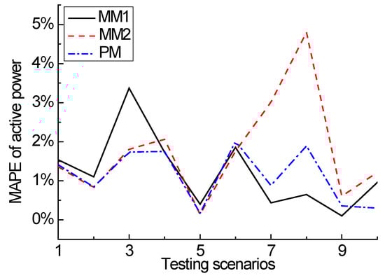 As shown in Table 2 and Figure 5, for the pre-fault phase (), the PM constructed in this paper exhibited higher active power simulation accuracy except in Case 6. In this phase, the active power output of the WF is stable. Moreover, the performance difference of the two mechanism models is relatively fixed for different scenarios. It helps to improve the accuracy of the PM through the optimal configuration of weight coefficients. For the other four phases, the improvement in accuracy decreased slightly, and the accuracy of the PM was between the MM1 and MM2 in some scenarios. The reason lies in that the active power output of WF starts to fluctuate in those phases, and the performance difference of the two mechanism models also begins to change in different scenarios. However, taking the quasi-steady-state phase during the fault into account, where the phenomenon that the accuracy of the PM is between the MM1 and MM2 appears more often, the active power errors of each model are presented in Figure 7. It can be seen that the active power performance of the PM is more stable than that of the MM1 and MM2, indicating its better adaptability.