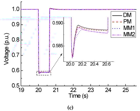 To further demonstrate the effectiveness of the PM, the dynamic responses of the DM, PM, MM1 and MM2 in Cases 6 and 3 are presented in Figure 9 and Figure 10, respectively. As mentioned above, for Case 6, the accuracy of the PM was lower than both the MM1 and MM2. From Figure 9, we can observe that the PM remains accurate and has high correspondence with the electromechanical transient responses of the DM. For the other nine cases, for example, Case 3, it can be seen that the responses of the PM were much closer to that of the DM than the MM1 and MM2, as shown in Figure 10.
