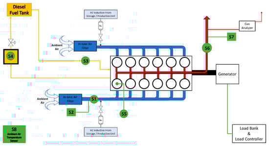 Figure 1, S3) was used. The latter is capable of measuring duel flow rates between 10–120 kg/h at a 0.1% accuracy. For the purposes of the present experimental study, and at a constant 1500 rpm operation of the engine, the fuel consumption was found to be between 35–45 kg/h.