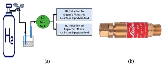 Figure 2a presents the configuration of the hydrogen supply to the air inlet of the engine. Hydrogen used for the purposes of the experimental setup was provided by Linde plc and had a purity of 99.999%. Hydrogen was contained in a cylinder at 200 bar pressure and the latter was equipped with a flashback arrestor (