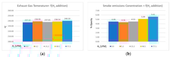 It is important to mention that prior to each experimental session, the engine was operated for more than 30 min so that steady state operation was achieved. This was confirmed with the use of the EGT graph versus time, when no significant change of the exhaust gas temperature was observed. Generally, EGT steady state is achieved faster in water-cooled engines, rather than the air-cooled engine used in the present experimental setup and, therefore, the engine load was kept constant while the hydrogen concentration added to the inlet varied.
